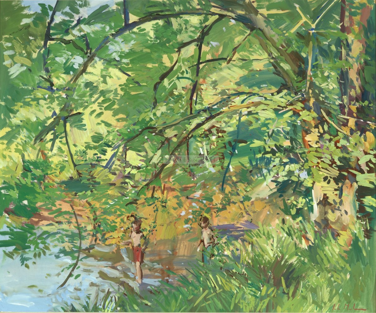 Paddling in the river, shady trees