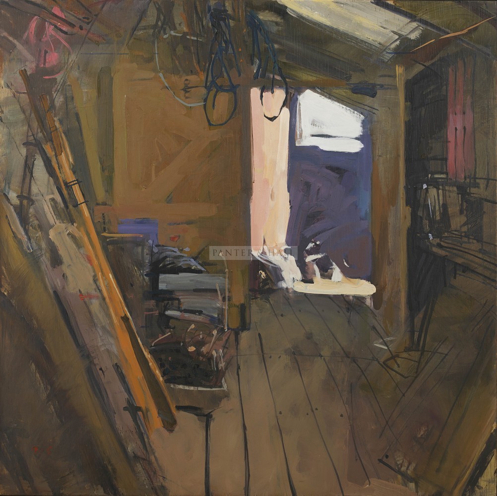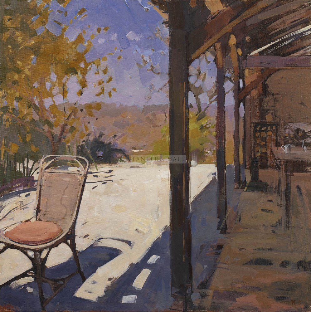 His paintings are technically superb pictorial essays in light and shade; each capturing what he describes as ‘a dramatic alchemy’, the transformation of things and places when hit by sunlight or immersed in shadow. Although unpopulated his works are full of narrative and often an element of mystery. His eye seeks the quiet places left by humanity: the relics of a once busy boatshed or a seemingly abandoned jetty, a terrace of empty chairs vacated minutes or perhaps years before. There are however no ghosts in these timeless corners of old Cornwall, instead Richard shows us a warm, inviting, sun dappled world of tranquillity and beauty.
