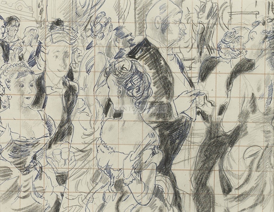pencil, ink and watercolour